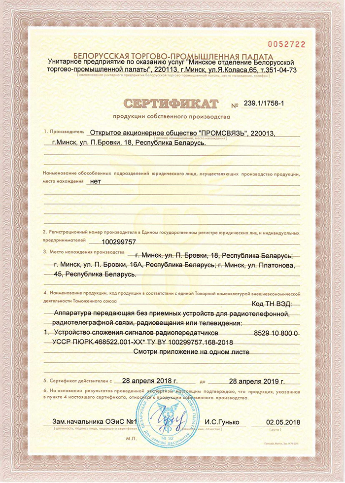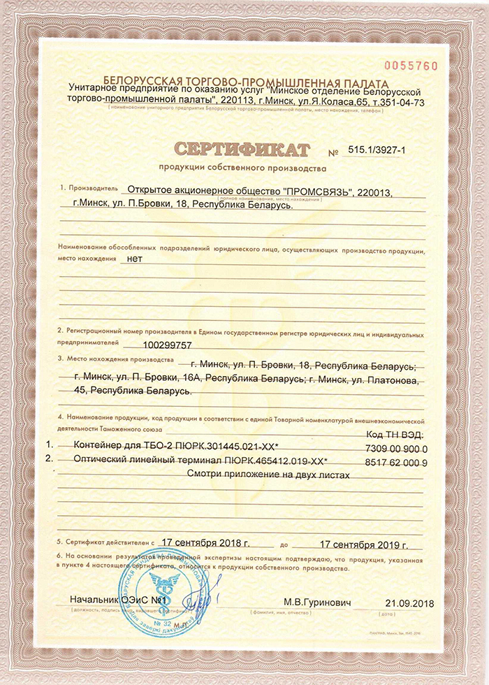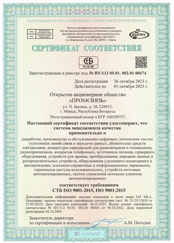 ОАО "ПРОМСВЯЗЬ" производит телекоммуникационное оборудование и оборудование электросвязи, а также предоставляет ряд услуг в области телекоммуникаций, банковских и информационных технологий. ОАО "ПРОМСВЯЗЬ" - единственное предприятие Министерства связи и информатизации Республики Беларусь, оно демонстрирует исключительные стандарты производства, сочетая инновационные технологии и строгий контроль качества.